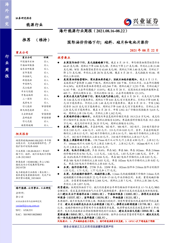 【兴业证券】【20210822】海外能源行业周报:国际油价价格下行;硅料、硅片和电池片涨价-22页
