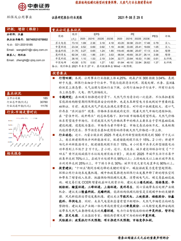 【中泰证券】【20210829】环保及公用事业:能源结构低碳化转型的重要保障,天然气行业长期前景向好-27页