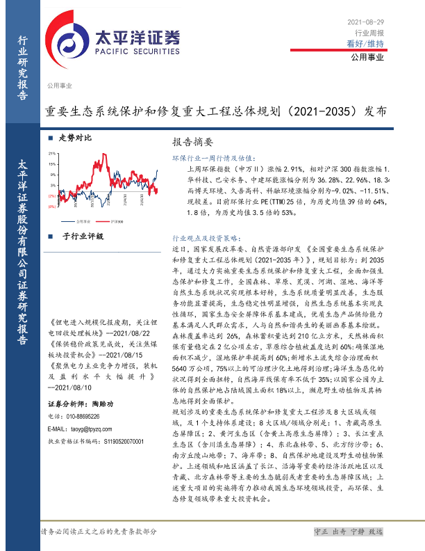 【太平洋证券】【20210829】公用事业行业周报:重要生态系统保护和修复重大工程总体规划(2021-2035)发布-13页