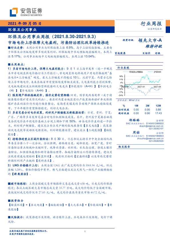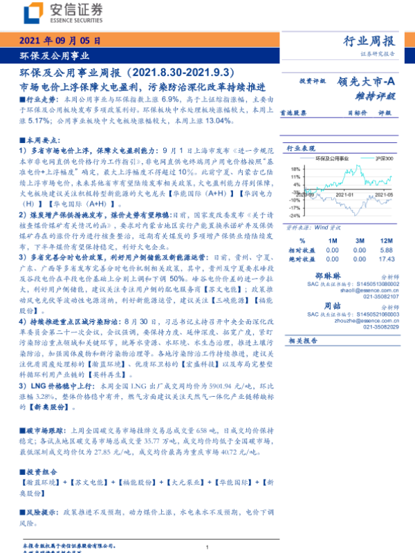 【安信证券】【20210905】环保及公用事业周报:市场电价上浮保障火电盈利,污染防治深化改革持续推进-15页