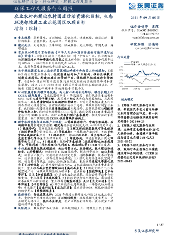 【东吴证券】【20210905】环保工程及服务行业周报:农业农村部提出农村固废防治资源化目标,生态环境部推进工业示范园区双碳目标-37页