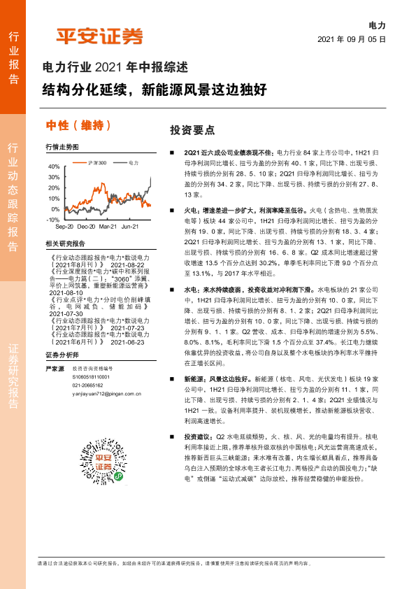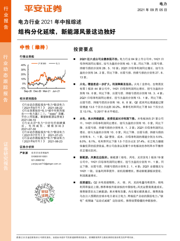 【平安证券】【20210905】电力行业2021年中报综述:结构分化延续,新能源风景这边独好-15页