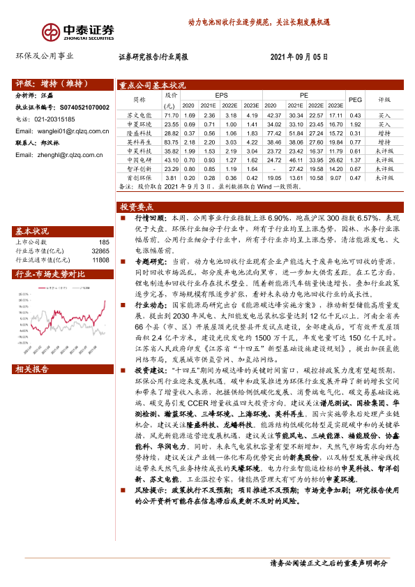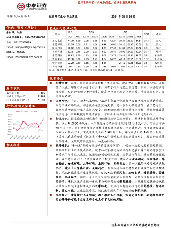 公用事业 动力电池回收 环保行业 碳中和 行业周报