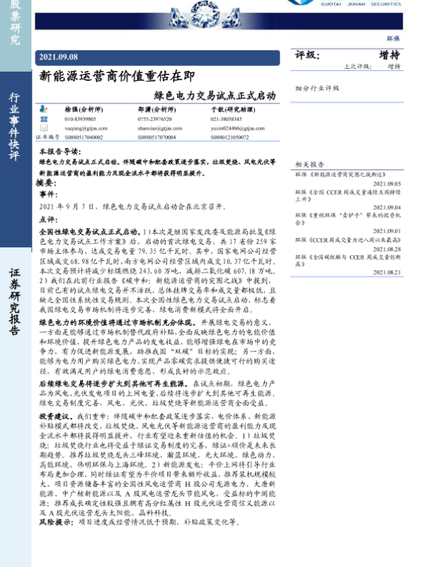 【国泰君安证券】【20210908】环保行业事件快评:绿色电力交易试点正式启动:新能源运营商价值重估在即-3页