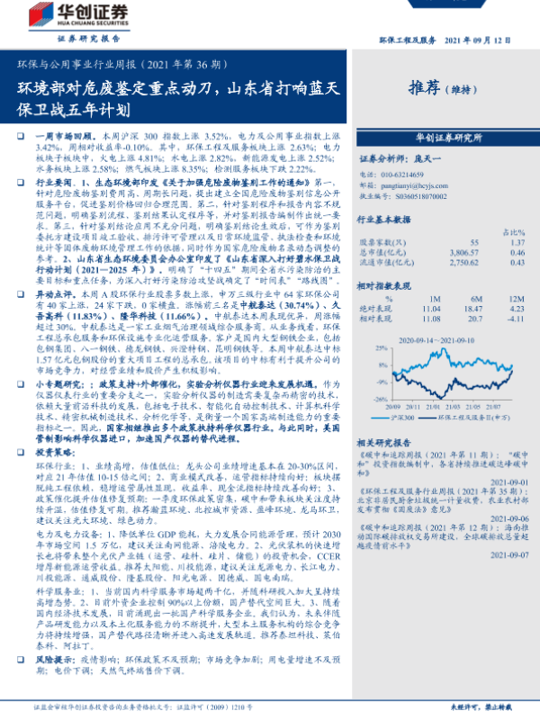 【华创证券】【20210912】环保与公用事业行业周报:环境部对危废鉴定重点动刀,山东省打响蓝天保卫战五年计划-19页