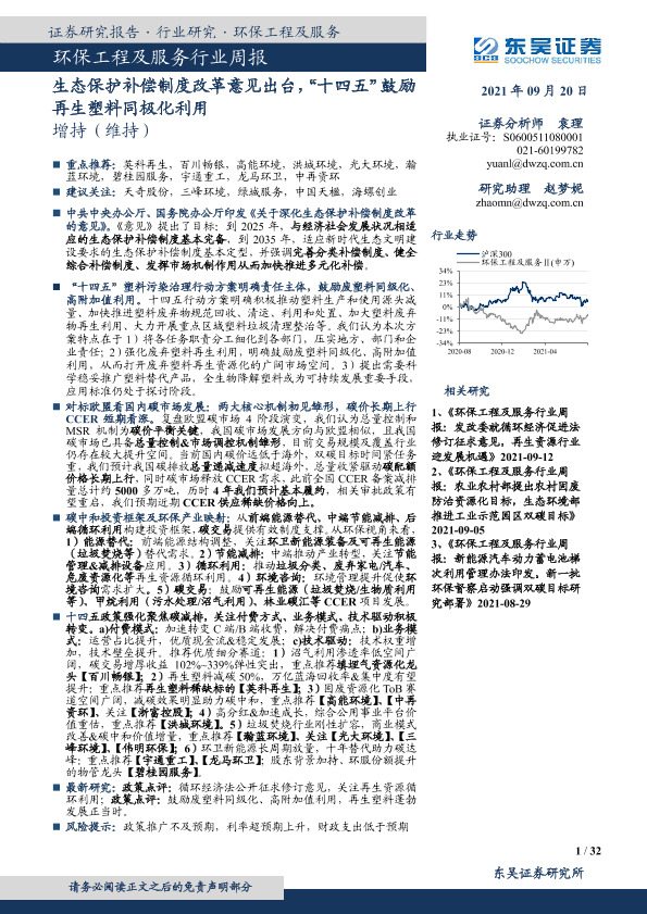 【东吴证券】【20210920】环保工程及服务行业周报:生态保护补偿制度改革意见出台,“十四五”鼓励再生塑料同极化利用-32页