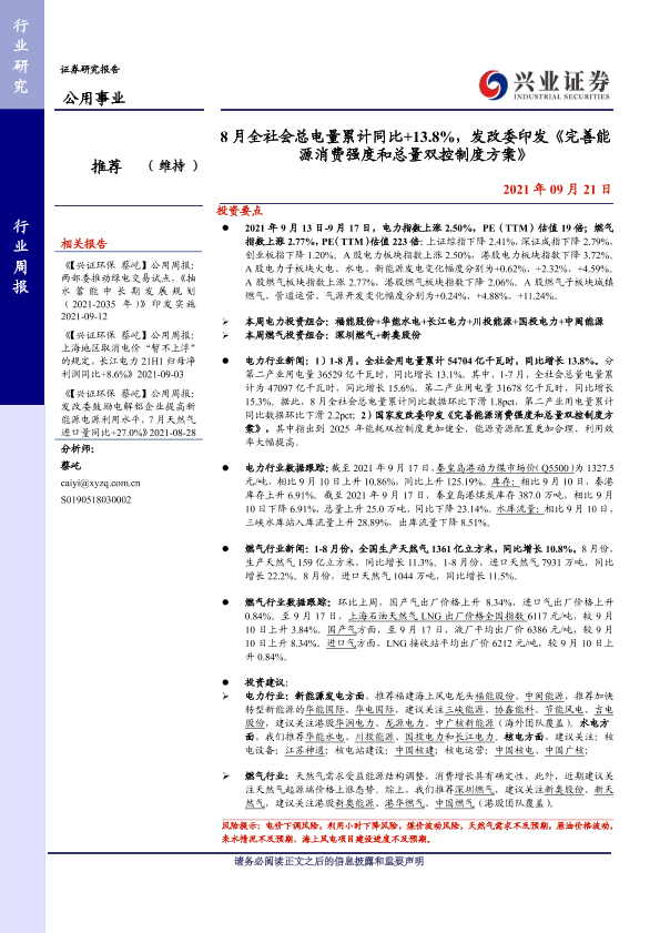 【兴业证券】【20210921】8月全社会总电量累计同比+13.8%,发改委印发《完善能源消费强度和总量双控制度方案》-14页