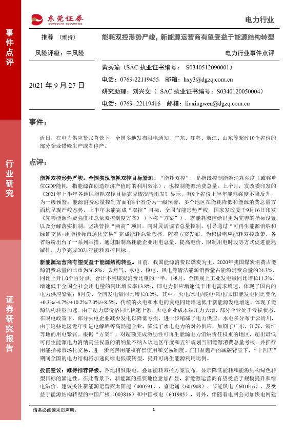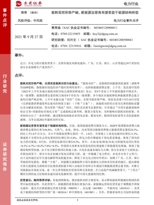 【东莞证券】【20210927】电力行业事件点评:能耗双控形势严峻,新能源运营商有望受益于能源结构转型-3页