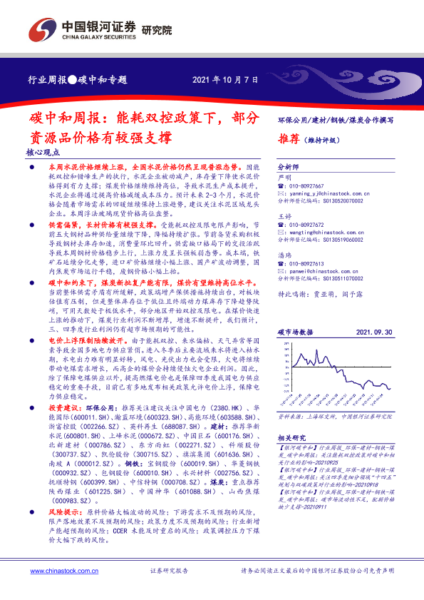 【银河证券】【20211007】碳中和周报:能耗双控政策下,部分资源品价格有较强支撑-21页