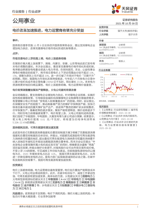 【天风证券】【20211009】公用事业行业点评:电价改革加速推进,电力运营商有望充分受益-2页