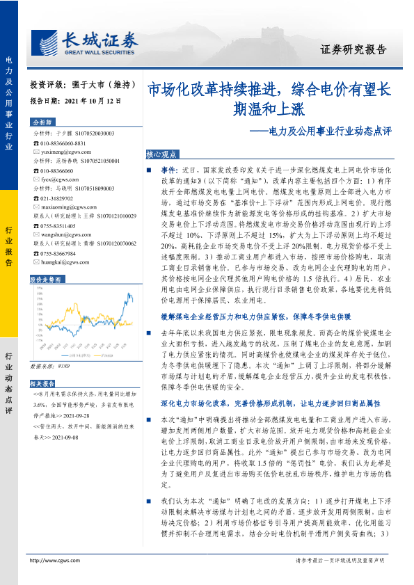【长城证券】【20211012】电力及公用事业行业动态点评:市场化改革持续推进,综合电价有望长期温和上涨-3页