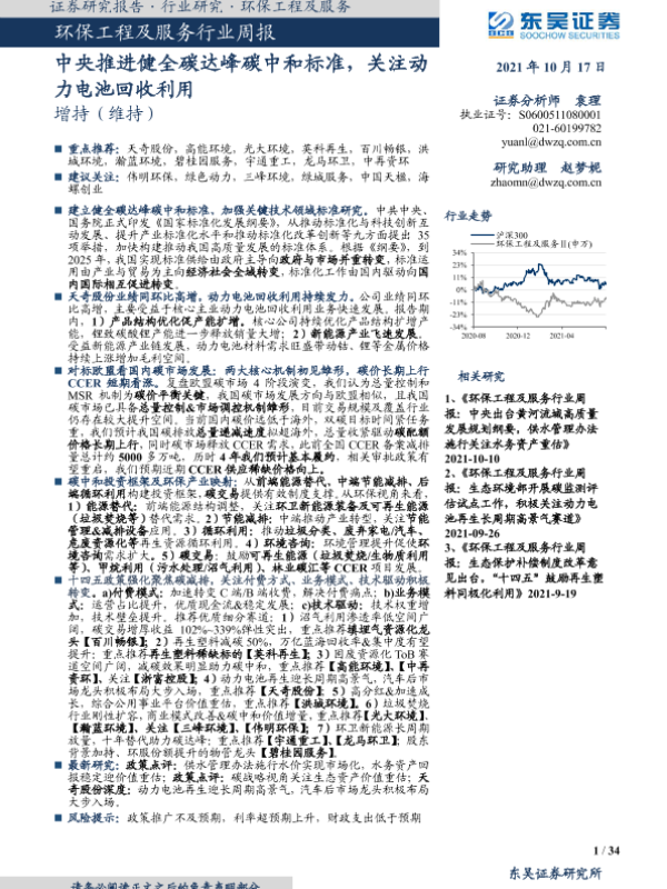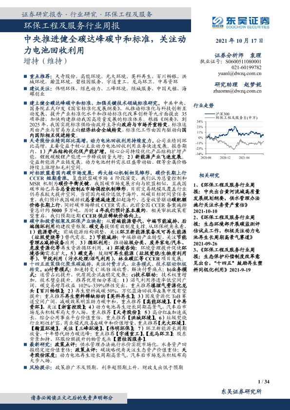 【东吴证券】【20211017】环保工程及服务行业周报:中央推进健全碳达峰碳中和标准,关注动力电池回收利用-34页