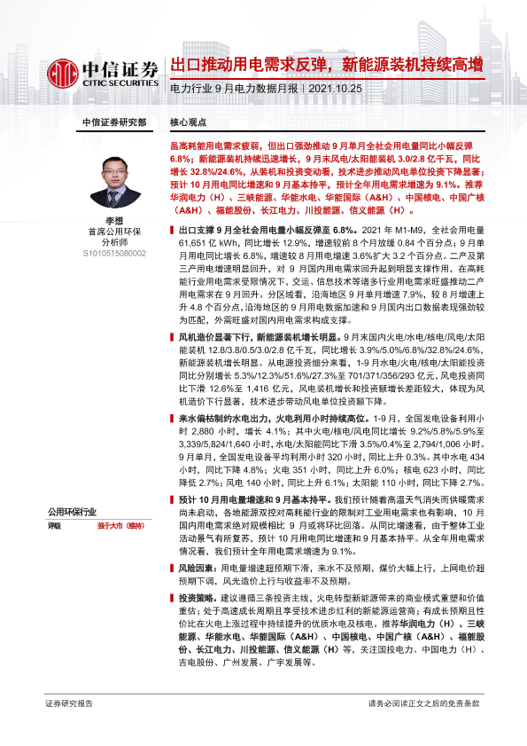 【中信证券】【20211025】9月电力数据月报:出口推动用电需求反弹,新能源装机持续高增-14页