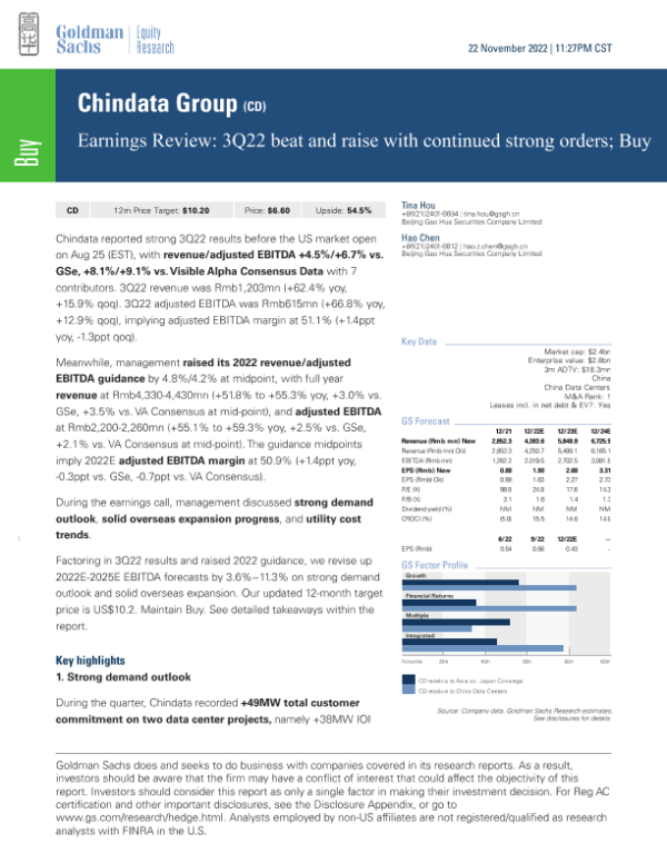 【Goldman Sachs】【20221122】Chindata 3Q22收益超出预期并上调全年指引;买入评级-9页
