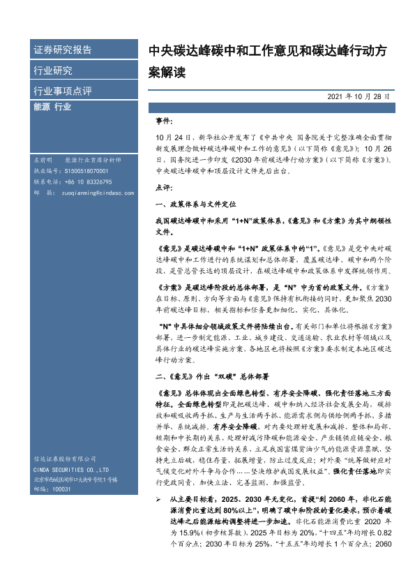 【信达证券】【20211028】中央碳达峰碳中和工作意见和碳达峰行动方案解读-9页
