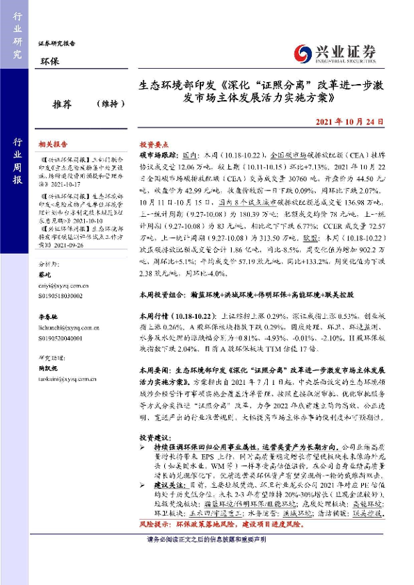 【兴业证券】【20211024】环保行业周报:生态环境部印发《深化“证照分离”改革进一步激发市场主体发展活力实施方案》-11页