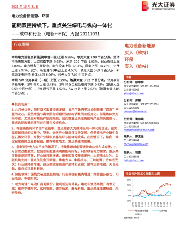 【光大证券】【20211031】碳中和行业(电新+环保)周报:能耗双控持续下,重点关注绿电与纵向一体化-28页