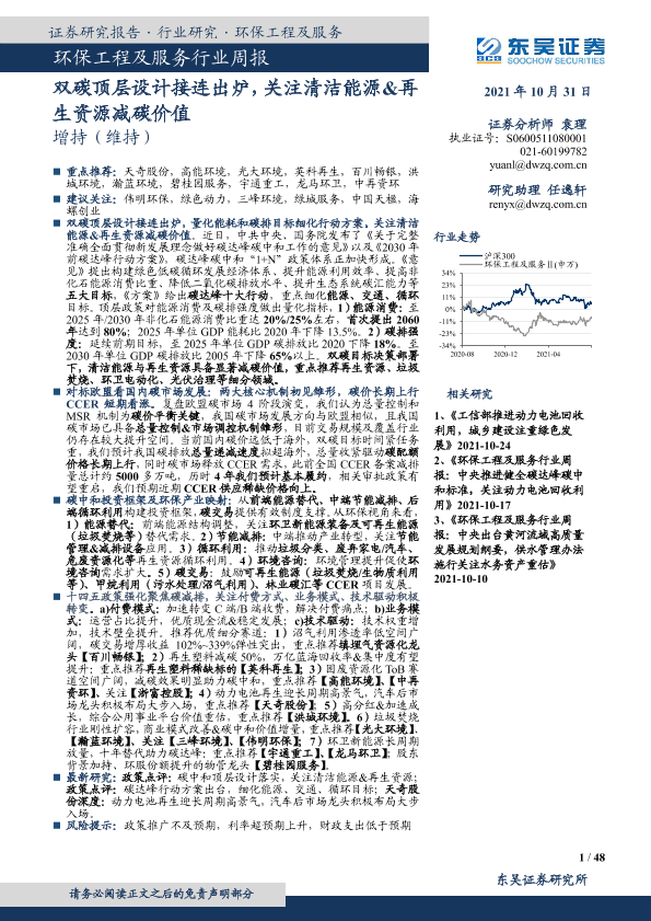 【东吴证券】【20211031】环保工程及服务行业周报:双碳顶层设计接连出炉,关注清洁能源&再生资源减碳价值-48页