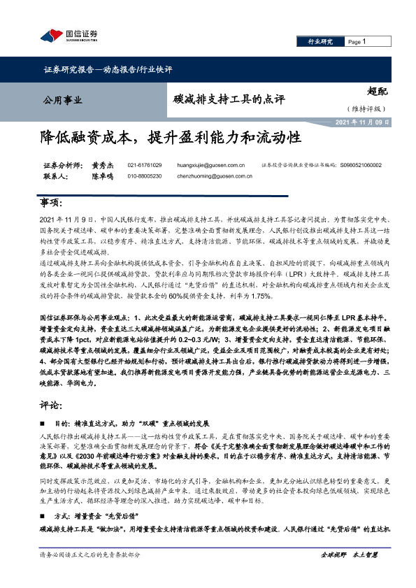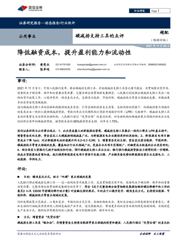 【国信证券】【20211109】公用事业碳减排支持工具的点评:降低融资成本,提升盈利能力和流动性-6页