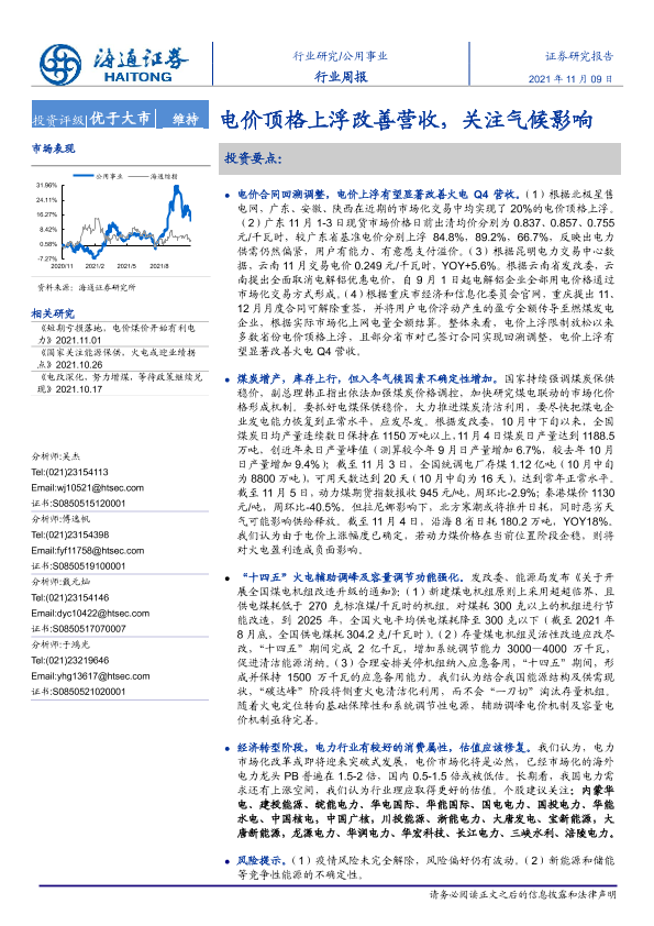 【海通证券】【20211109】公用事业行业周报:电价顶格上浮改善营收,关注气候影响-2页