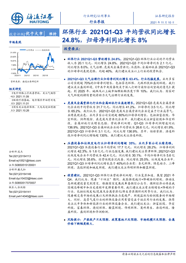 【海通证券】【20211110】公用事业行业季报:环保行业2021Q1-Q3平均营收同比增长24.8%,归母净利同比增长8%-20页