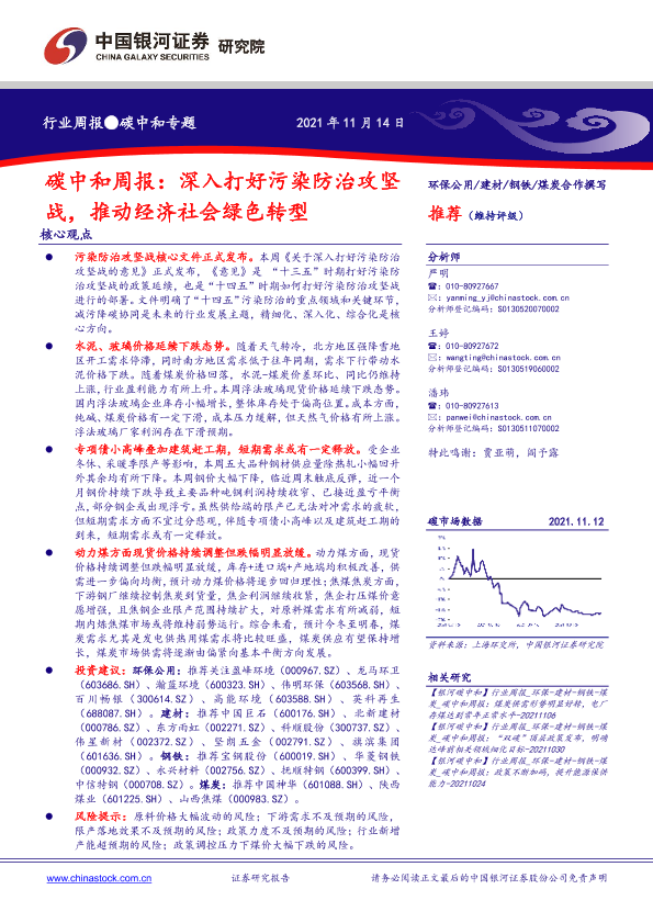 建材钢铁煤炭 污染防治 环保公用 碳中和 绿色转型