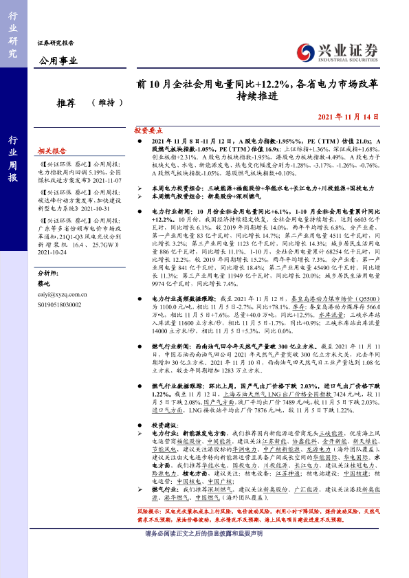 【兴业证券】【20211114】前10月全社会用电量同比+12.2%,各省电力市场改革持续推进-24页