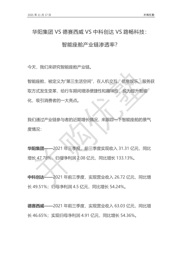 【并购优塾】【20211117】智能座舱产业链渗透率-30页