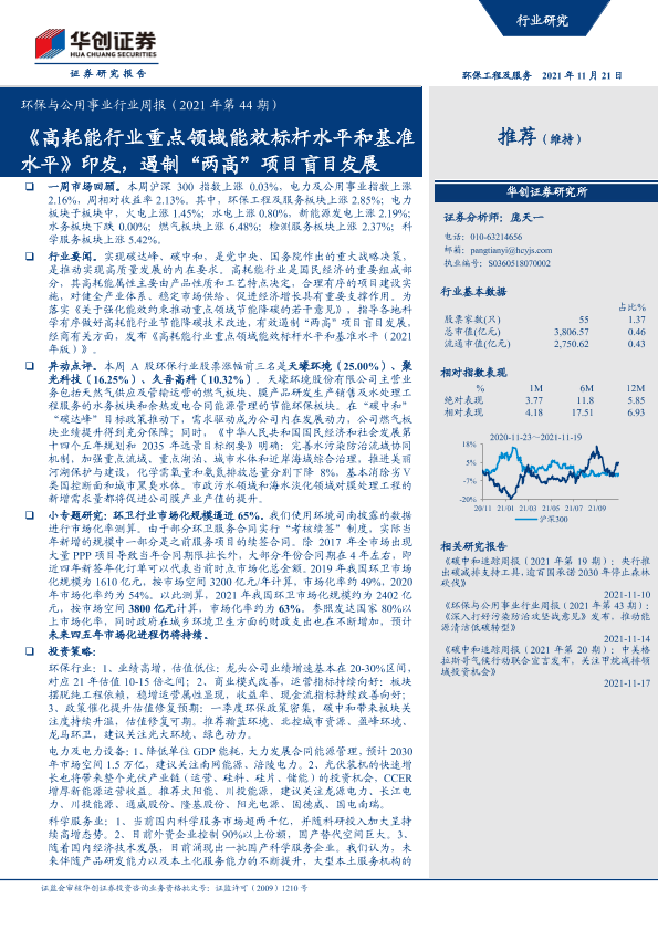 【华创证券】【20211121】环保与公用事业行业周报:《高耗能行业重点领域能效标杆水平和基准水平》印发,遏制“两高”项目盲目发展-22页