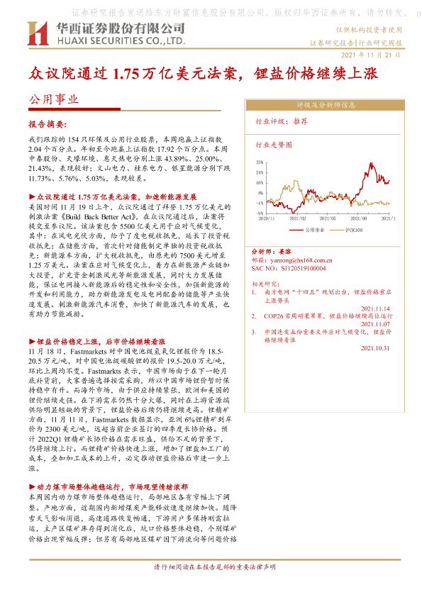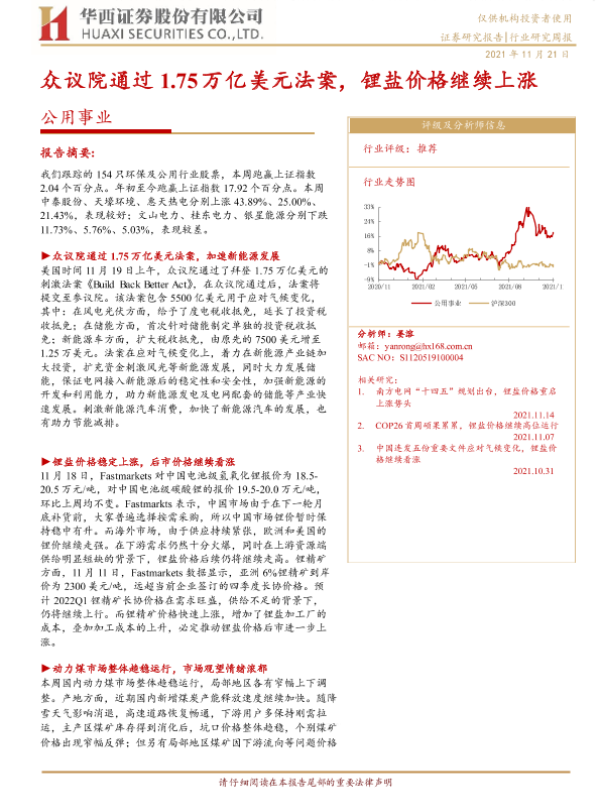 【华西证券】【20211121】公用事业行业研究周报:众议院通过1.75万亿美元法案,锂盐价格继续上涨-18页
