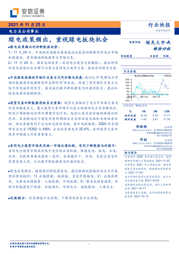 【安信证券】【20211125】电力及公用事业:绿电政策频出,重视绿电板块机会-3页