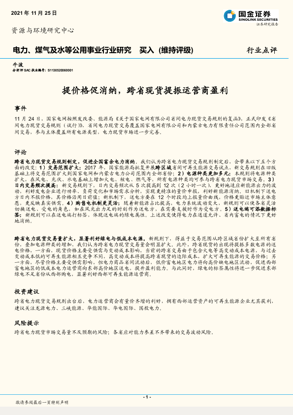 【国金证券】【20211125】电力、煤气及水等公用事业行业研究:提价格促消纳,跨省现货提振运营商盈利-3页