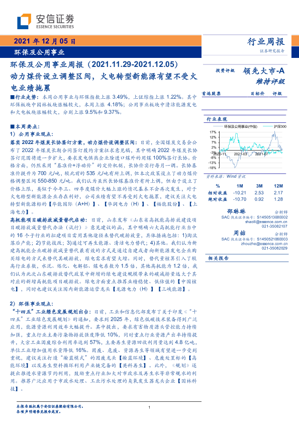 【安信证券】【20211205】环保及公用事业周报:动力煤价设立调整区间,火电转型新能源有望不受火电业绩拖累-17页