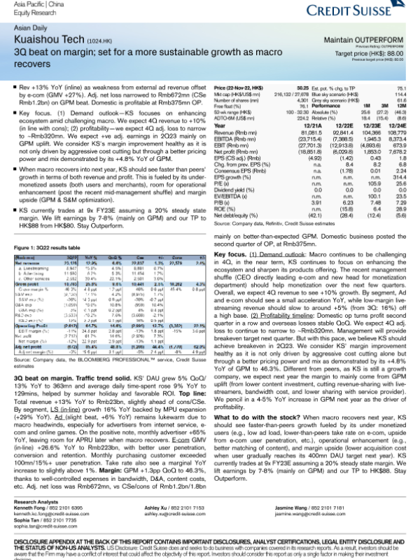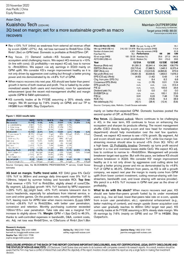 【Credit Suisse】【20221123】Kuaishou Tech (1024.HK) 3Q beat on margin; set for a more sustainable growth as macro recovers-5页