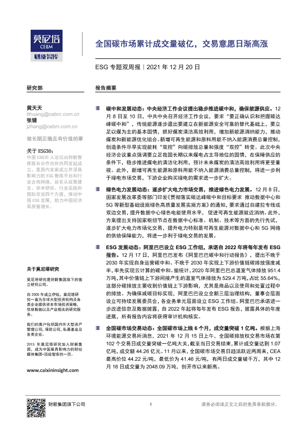 【莫尼塔研究】【20211220】全国碳市场累计成交量破亿,交易意愿日渐高涨-8页