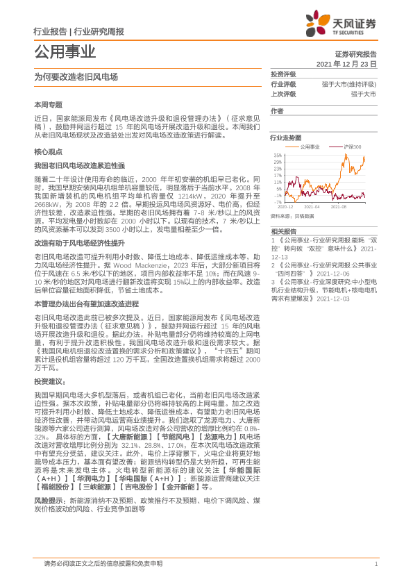 【天风证券】【20211223】公用事业行业研究周报:为何要改造老旧风电场-15页