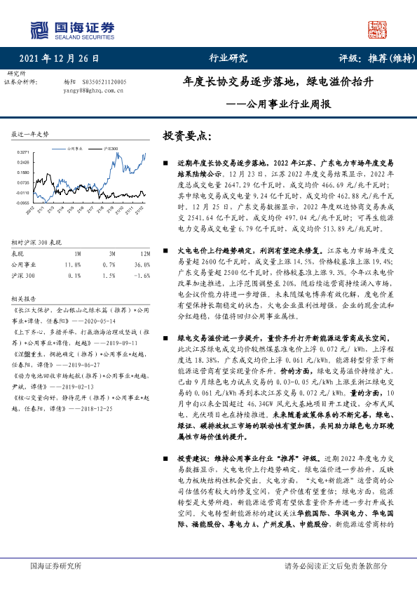 【国海证券】【20211226】公用事业行业周报:年度长协交易逐步落地,绿电溢价抬升-18页