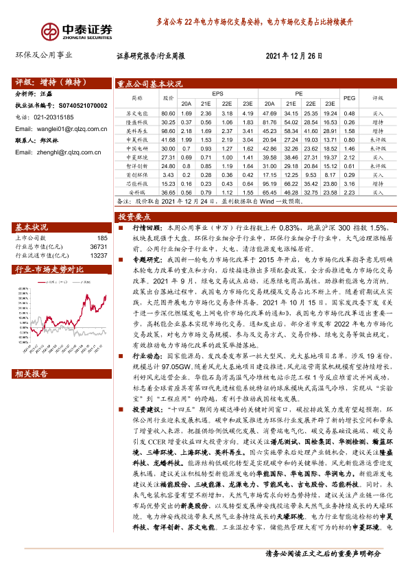 公用事业 环保产业 电力市场化 碳中和 能源转型