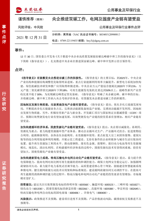 【东莞证券】【20211231】公用事业及环保行业事件点评:央企推进双碳工作,电网及固废产业链有望受益-2页