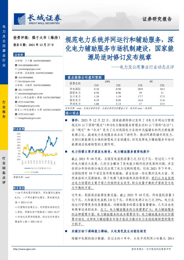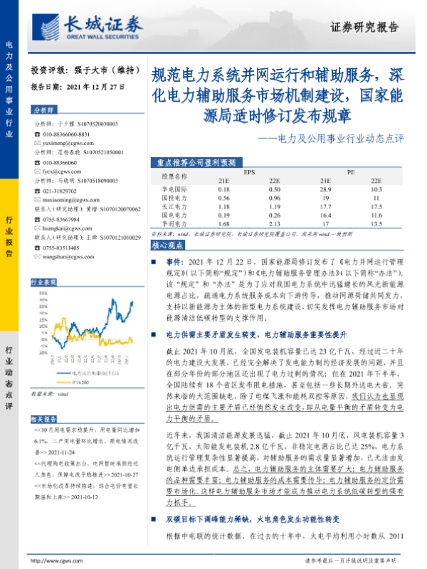 【长城证券】【20211227】电力及公用事业行业动态点评:规范电力系统并网运行和辅助服务,深化电力辅助服务市场机制建设-3页