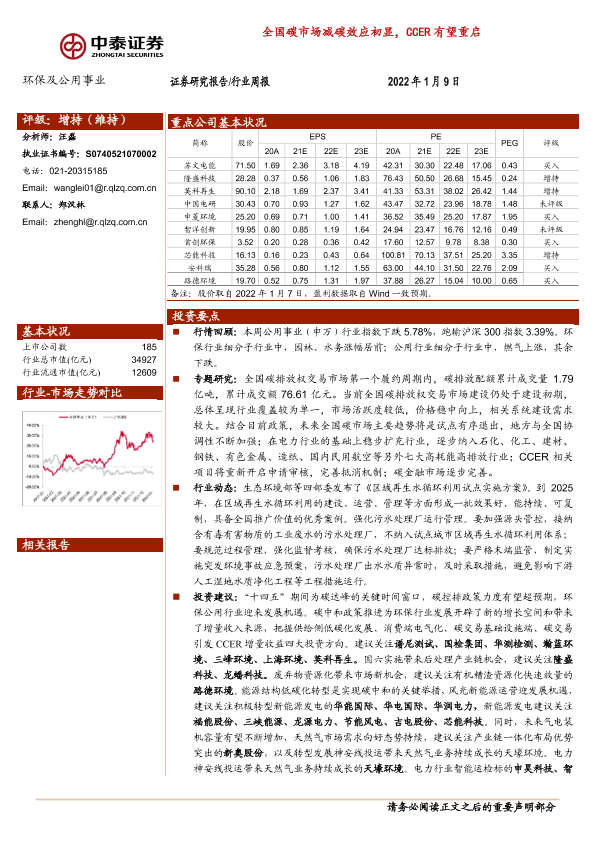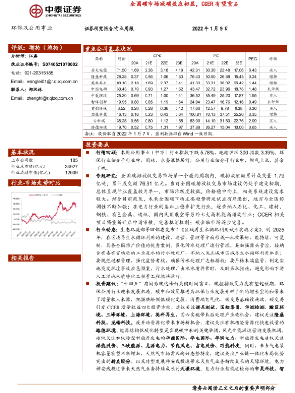 【中泰证券】【20220109】环保及公用事业行业周报:全国碳市场减碳效应初显,CCER有望重启-21页