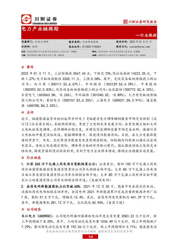 川财证券 电力产业链 电力行业 研究报告 行业动态