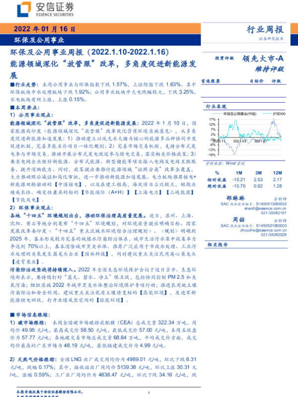 【安信证券】【20220116】环保及公用事业周报:能源领域深化“放管服”改革,多角度促进新能源发展-17页