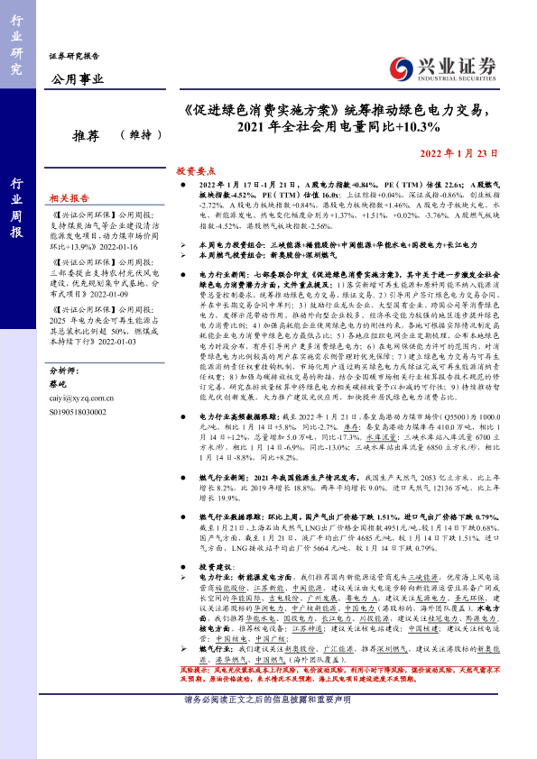 【兴业证券】【20220123】促进绿色消费实施方案统筹推动绿色电力交易-22页