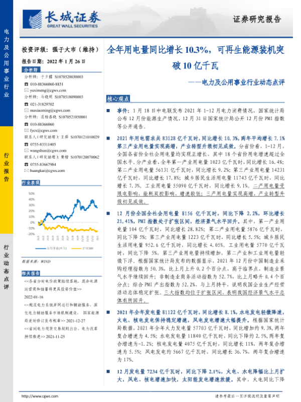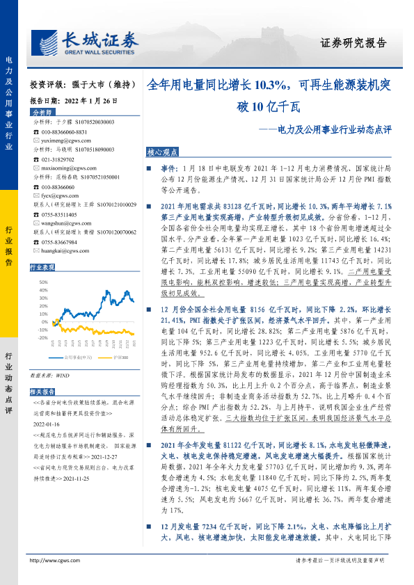 【长城证券】【20220126】电力及公用事业行业动态点评:全年用电量同比增长10.3%,可再生能源装机突破10亿千瓦-3页