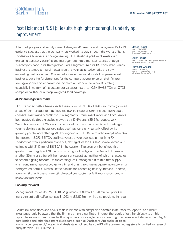 【Goldman Sachs】【20221118】Post Holdings (POST) Results highlight meaningful underlying improvement-7页