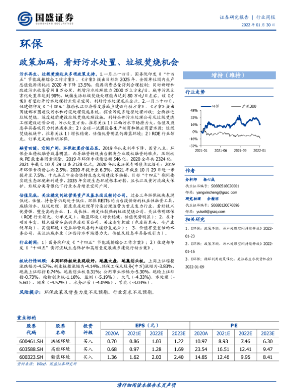 【国盛证券】【20220130】环保行业周报:政策加码,看好污水处置、垃圾焚烧机会-13页