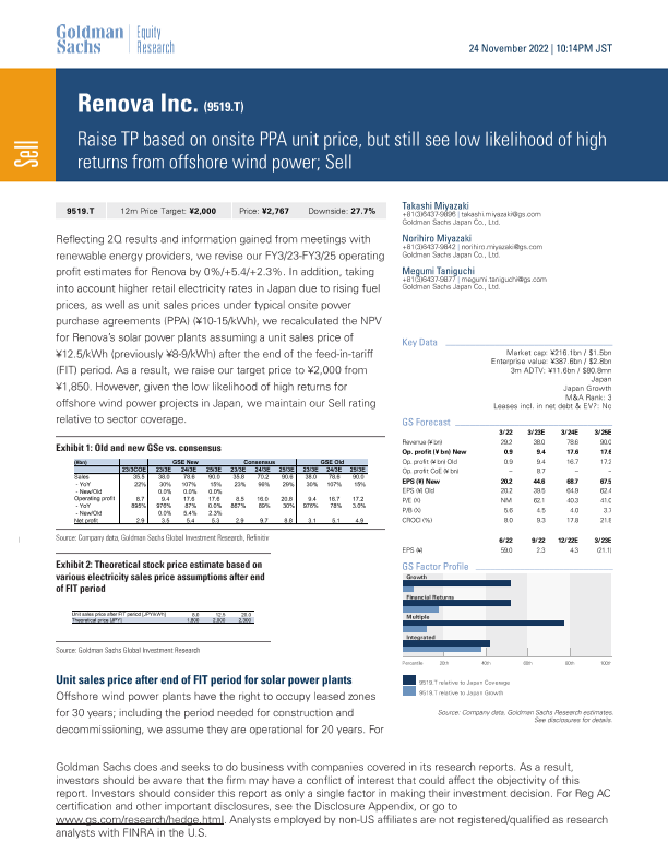 【Goldman Sachs】【20221124】Renova Inc. (9519.T) - Raise TP based on onsite PPA unit price, but still see low likelihood of high returns from offshore wind power; Sell-8页