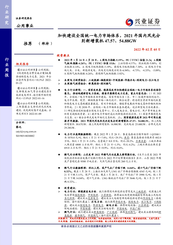 【兴业证券】【20220205】加快建设全国统一电力市场体系,2021年国内风光分别新增装机47.57、54.88GW-25页