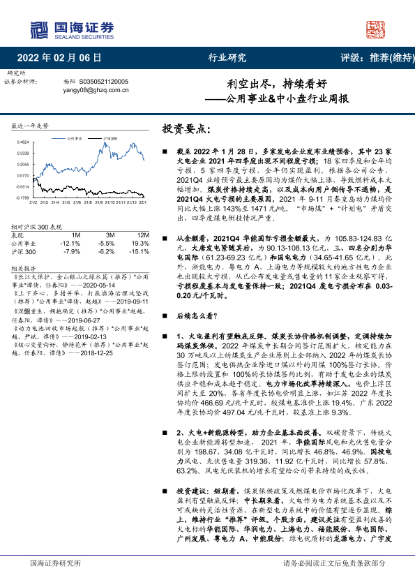 【国海证券】【20220206】利空出尽,持续看好 ——公用事业&中小盘行业周报-17页